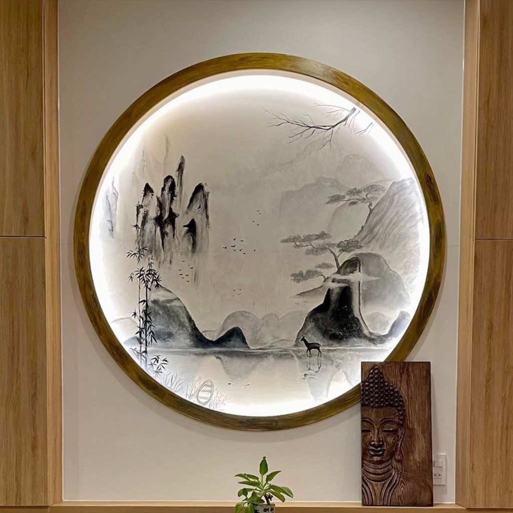 Available in custom sizes upon request, the T118 landscape painting can be tailored to suit a variety of spaces and artistic intentions. Typical dimensions include a diameter of 80 cm or other bespoke proportions based on your design needs. Each piece is meticulously crafted by skilled artists using traditional ink on handmade paper to maintain authenticity and depth of expression.