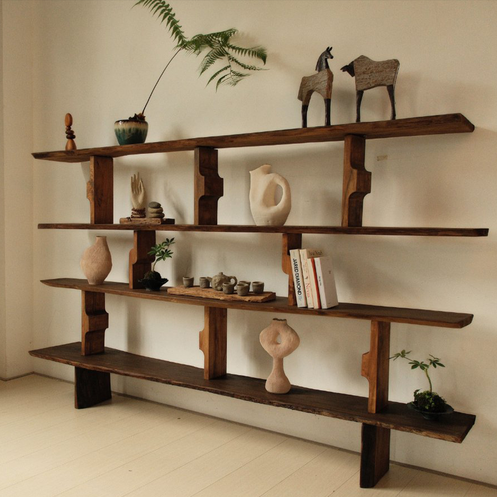 Each shelf offers generous surface area for books, art objects, curated collections, and decorative accents, allowing the piece to serve both functional and aesthetic purposes. The open design enables objects to breathe visually, while the natural wood finish enhances the tactile character and invites touch.